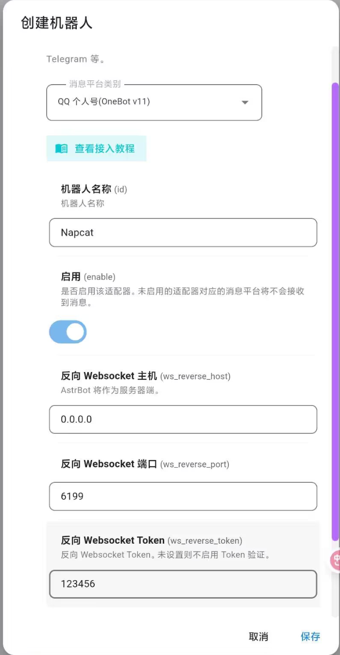 这里只讲如何连接 NapCat QQ,其他配置自行查看 AstrBot 官方文档